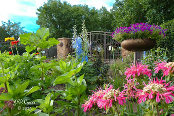 The Entry Garden is located on both sides of the walkway before entering the Garden gate. Plantings include annuals along with a few perennials. The annuals range in design from traditional to edible to whimsical. Always a surprise from one year to the next!